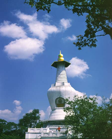 揚州的白塔高 27.5 米 ,下面是束腰須彌塔座,八面四角,每面三龕,龕內雕刻著十二生肖像。和北海白塔的厚重穩健不同,揚州白塔比例勻稱,玉立亭亭。和身邊的五亭橋相映成趣。